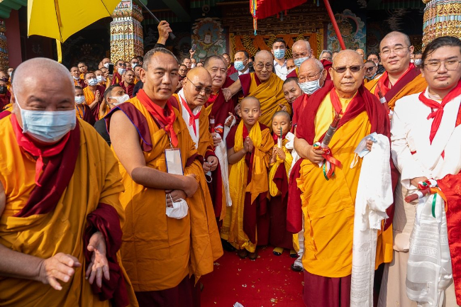 2023年1月18日,在印度比哈爾的菩提迦耶白玉南卓林寺院,藏傳佛教寧瑪派僧眾列隊迎接達賴喇嘛尊者的蒞臨。