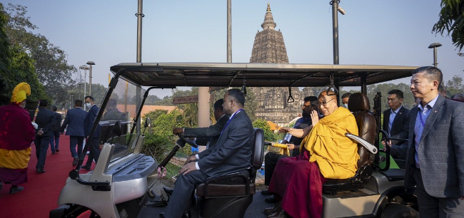 16日上午,達賴喇嘛尊者乘坐高爾夫球車前往摩訶菩提寺朝聖