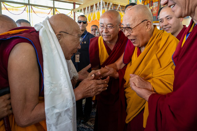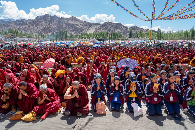 ![]() 【拉達克訊】八月的拉達克高原,天空湛藍澄澈,白雲悠然飄浮,遠方群山巍峨聳立。今天上午(8月16日),達賴喇嘛尊者在列城時輪金剛廣場,向來自拉達克及喜馬拉雅各地的近五萬名信眾,傳授並講解格西朗日塘巴的《修心八頌》以及七世達賴喇嘛的《四念處歌》。 清晨時分,彩色經幡隨風獵獵飄揚,廣場內外早已人潮湧動。眾多民眾手撐五彩傘,頂著烈日恭候,只為親聞尊者的開示。身著袈裟的僧侶與穿著傳統服飾的民眾齊聚一堂,展現出喜馬拉雅山區人民對佛法的虔誠信仰與殷切渴望。當地社群以傳統音樂與舞蹈迎接尊者,鼓聲震天,洋溢著歡欣與敬意。 尊者以慈悲與智慧的法語,為信眾帶來心靈的啟迪與慰藉。法會現場莊嚴而溫暖,許多人雙手合十、眼含淚光,沉浸於佛法祥和的力量之中。對所有參與者而言,這不僅是一場盛大的法會,更是一場深刻的心靈洗禮與珍貴祝福。