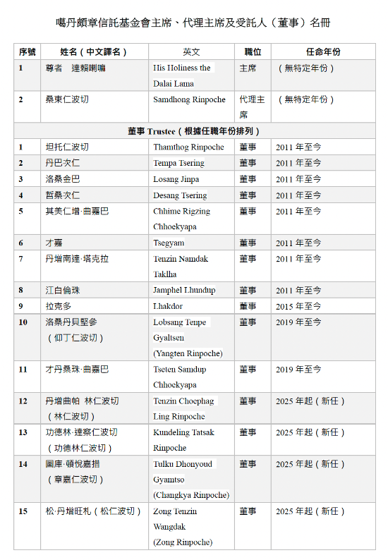 噶丹頗章最初由第二世達賴喇嘛於1518年創立,作為其領地的行政機構。1642年,第五世達賴喇嘛成為西藏的政教領袖,隨之建立了「噶丹頗章政府」,作為統一西藏的中央政權,自此以來,歷代達賴喇嘛皆引領西藏民族的命運。 在歷史長河中,噶丹頗章於歷代達賴喇嘛的認定、教育與福祉方面,始終擔當核心角色,恪守藏傳佛教延續千年的傳統。噶丹頗章嚴格依循與達賴喇嘛轉世制度緊密相連的宗教程序,並廣泛諮詢藏傳佛教主要傳承的高僧大德與誓言護法的指引。 2011年,達賴喇嘛尊者主動將政治職權移交予民選的西藏政治領導人。此後,「達賴喇嘛尊者辦公室 — 噶丹頗章」根據1908年《印度註冊法案》正式在印度達蘭薩拉註冊為私人信託機構,並依法獲得法人地位。 噶丹頗章信託基金會的宗旨是護持與弘揚達賴喇嘛制度及其精神志業,推動尊者的人道主義願景。信託基金會長期支持達賴喇嘛尊者的四大核心承諾:弘揚人類普世價值、促進宗教間和諧、維護西藏文化與民族認同,以及推動環境保護與古印度智慧的現代應用。 2025年5月21日,達賴喇嘛尊者明確宣布達賴喇嘛轉世制度將持續延續,並重申未來第十五世達賴喇嘛的認定工作,應由噶丹頗章信託基金會承擔主要責任。信託基金會將依循傳統程序,負責轉世靈童的尋找、認定、教育與護持等全程事務。 除了履行其宗教與精神責任外,該信託基金亦積極支持藏人社群的福祉,並參與多項體現尊者普世責任理念的教育、人道與環保項目,持續推動達賴喇嘛終生奉行的核心使命——促進人類一體性理念與世界和平。 噶丹頗章信託基金會由董事會管理運作。董事會由其尊敬的創辦人擔任主席,並設有一位代理主席及十五位董事共同組成。 ![]() |