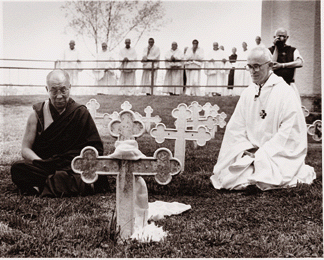 達賴喇嘛尊者在托馬斯·梅頓墓前祈禱(1996) 達賴喇嘛始終沒有忘記梅頓。 在1990年出版的第二部自傳《流亡中的自由》中, 他回憶梅頓的來訪,稱之為在那段時間裡他“最快樂的時刻”之一。1996年,在梅頓去世28年後,達賴喇嘛來到肯塔基克西瑪尼修道院,參加第一屆“克西瑪尼交流會”。這時候,達賴喇嘛已經獲得諾貝爾和平獎,成為舉世聞名的精神領袖。在梅頓的墓前,達賴喇嘛盤膝而坐,雙手合十,默默祈禱。他感到自己的精神與梅頓相通。迄今為止,“克西瑪尼交流會”已經舉辦了三次。在這些交流會中,天主教與佛教僧尼,以及宗教學者們除了交流靈修經驗,討論得更多的是怎樣將宗教修持與社會關懷結合,使世界更美好。這一切,始於1968年11月初,東西方兩位大師性靈的交匯。 2013年1月2日,我在印度首都新德里採訪達賴喇嘛,請他敘述自己的精神旅程。談話中,達賴喇嘛對我說到梅頓,這位西方世界偉大的靈修大師:“他是讓我了解基督教的第一人。可惜,他過早去世了。”他沉默片刻,思緒仿佛回到了半個多世紀前的達蘭薩拉:“如果他今天還在,一定會是我的同道,我們會一起為共同的目標而努力。” ——《纵览中国》首发 —— 转载请注明出处 |