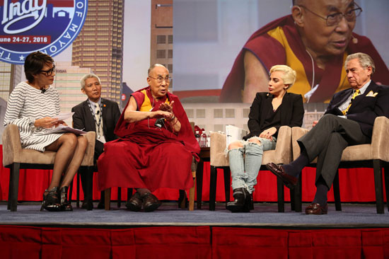 6月26日上午,達賴喇嘛尊者和名主持人安咖哩、歌后Lady Gaga、慈善家菲利普·安舒茨共同出席美國全國市長會議並回答問題。 |